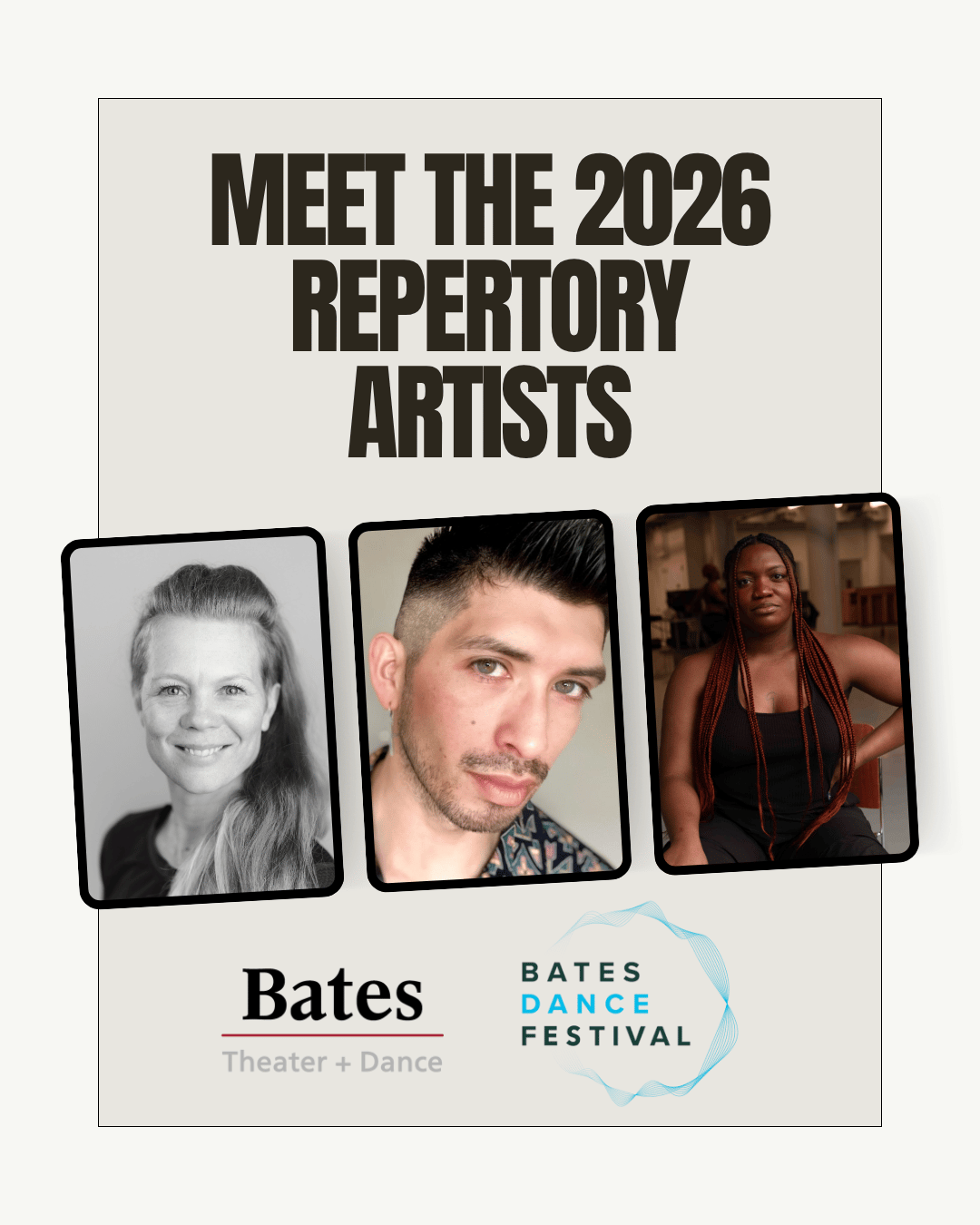 These nationally renowned artists, all artists-in-residence at the Bates Dance Festival, will engage with Bates students throughout the Winter semester in the Dance Repertory (DANC 253) & Repertory Styles (DANC 270D) courses. Students enrolled in these courses will experience a variety of approaches to making and performing dance. The works created with these artists will ultimately be performed in the 2026 Marcy Plavin Spring Dance Concert. |